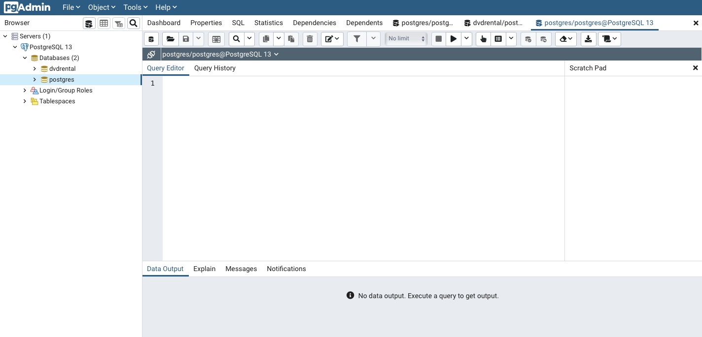 Servers > PostgreSQL 13 > Databases > postgres > (마우스 오른쪽 버튼 클릭) Query tool... 클릭