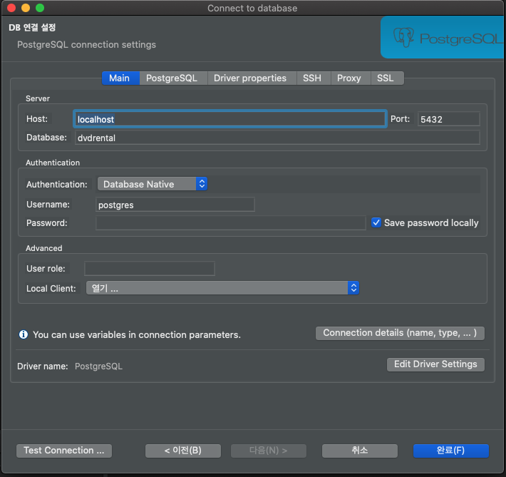 Local Client : PostgreSQL 13 으로 설정 후 완료 버튼